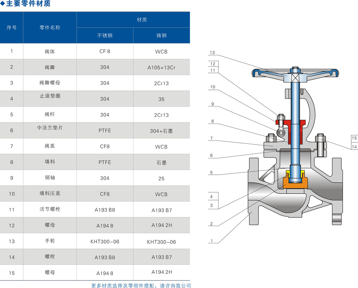 ⑨閥桿螺母:通常情況下,閥桿螺母材料采用銅合金。可以根據用戶要求采用高鎳鑄鐵等材料,對于大口徑的截止閥:閥桿螺母和閥桿之間設計有滾動軸承,可以有效減小截止閥的開啟力矩使閥門可以輕松開關。